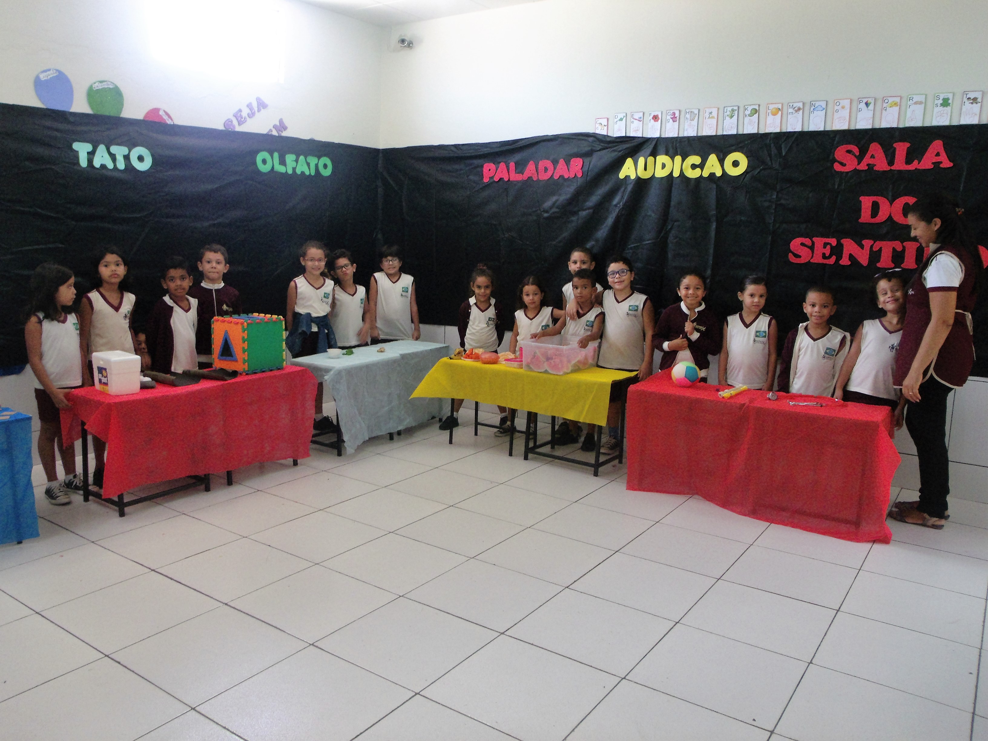 As professoras Jossiane Santos e Maria do Ó Soares realizaram com os alunos do 1º ano a Oficina de Ciências na manhã dessa sexta-feira (15/04/16). Criaram a Sala dos Sentidos com a finalidade dos alunos mostrarem o que aprenderam durante as aulas, além de permitir que eles desenvolvessem a linguagem oral e a autonomia.